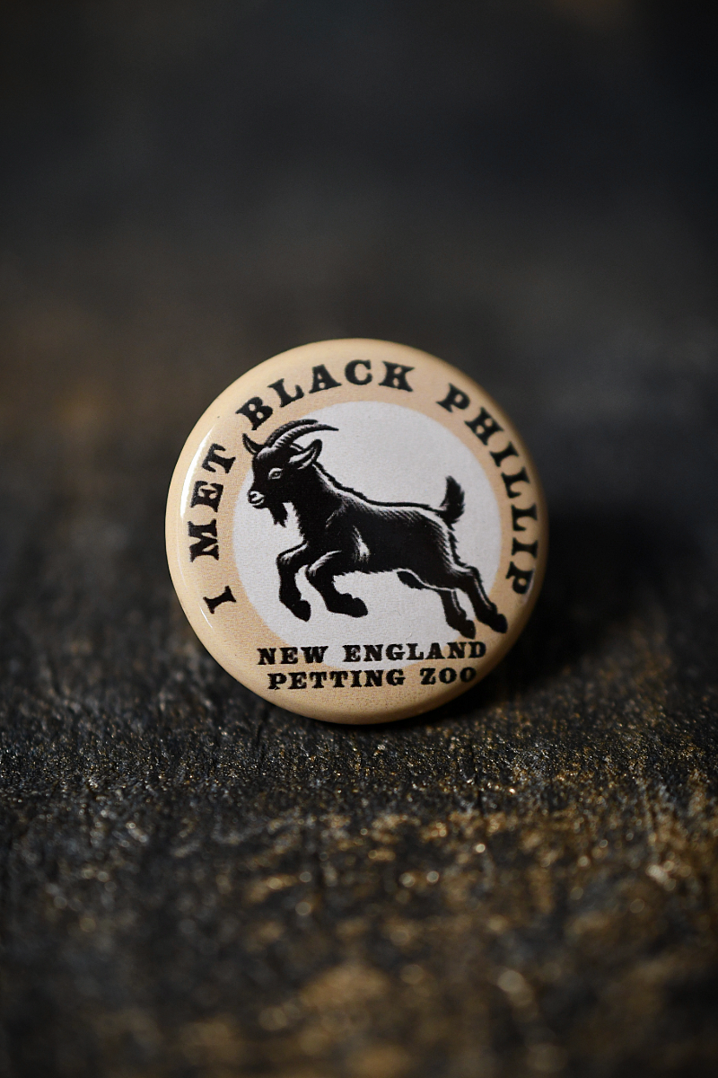 25mm pin badge with the phrase "I Met Black Phillip: New England Petting Zoo."