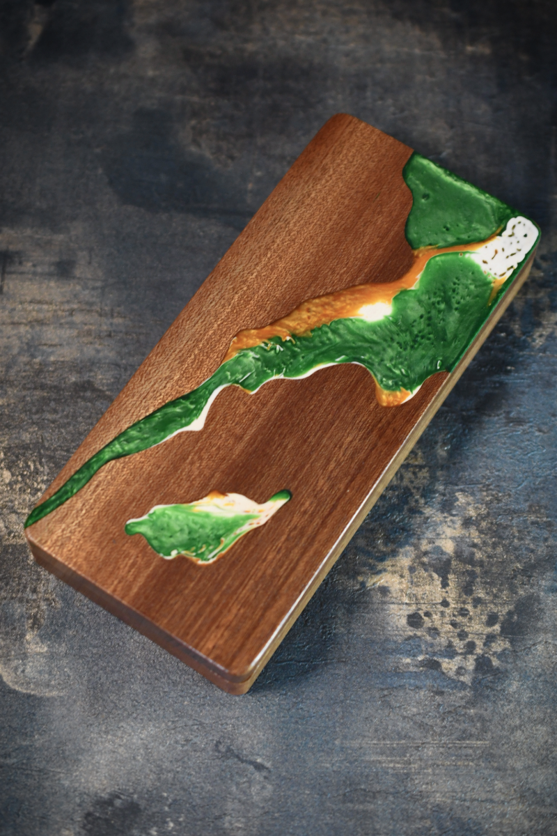 Works excellently to house two full polyhedral dice sets, fine pens and pencils, or even small miniatures. The inlaid green resin is reminiscent of a gelatinous monster, or a bitter poison. The lid doubles as a dice tray.