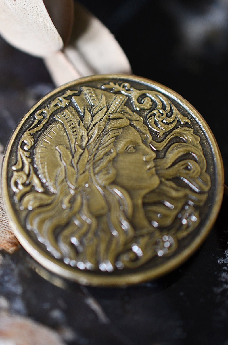 Heavyweight Collector's Coin in Solid Brass with a vision of Life as a Beautiful Warrioress and Death as a Knight.