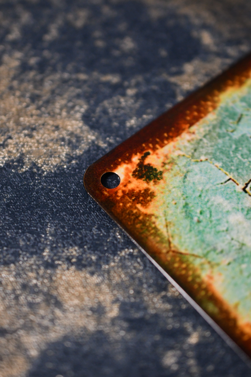 Decorative tin wall sign with punched corner holes, for hanging or screwing. Adds a chic, vintage reference to your stylish home.